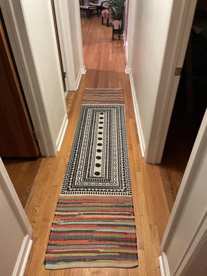 Just received this attractive runner and it really makes my hohum basement stairwell pop with design. Not sure how the cotton will hold up to the years but I love the rug’s looks.