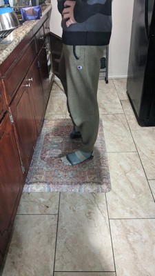 [This review was collected as part of a promotion.] I really enjoyed using this product. It is high quality. Standing on this kitchen mat is like standing on a cloud. I could literally stand on it forever even though I have a bad knee. It doesn't hurt it standing on this mat. It's anti-slip so mat stays in place at all times and make sure to place mat on a dry surface. Any spills can be quickly wiped up. Perfect for high traffic areas, Kitchen, laundry room, nursery, garage or anywhere really. This mat has a beautiful design on it. It has high quality materials. I definitely recommend Comfort Mat Collection - Heriz.