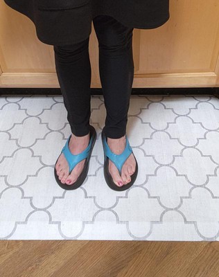 [This review was collected as part of a promotion.] I put this mat by my sink since I’m there a lot cleaning and washing dishes and I have to say it is very comfortable to stand on. It gives you cushion so your feet aren’t hurting after standing for awhile and it looks very cute in my kitchen. It is easy to clean off and I would def buy it again.