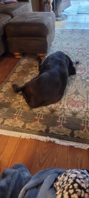 I bought this rug for under my dining room table, and I absolutely love it. It’s very subdued even though it may look busy it’s not! It goes with everything.