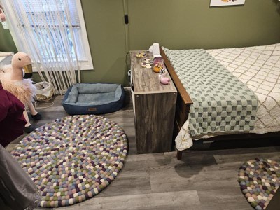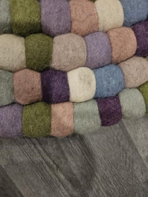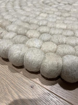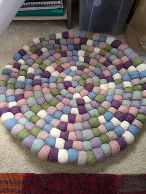 Very cute, very chunky wool rug. The felt balls were larger than I had realized from the listing online, so this is quite hefty and thick at the 2' round size. Would not work in a doorway, but I decided to use it as a pad to stand on at my ironing board and it works well for that. Colors are lovely.