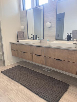 I loved this rug. It's very soft and cushy underfoot, and quite unusual. The color is a lovely soft neutral gray that will compliment a lot of interiors. It is very thick though, as shown in the description, a little over an inch. I found that a bit more awkward to deal with in the bathroom than I anticipated, so am exchanging for a slightly less "plush" carpet style. I almost kept it for a Yoga mat. It's delightful under the knees and elbows, but would be far to heavy to transport to classes, etc....