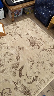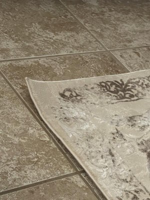 [This review was collected as part of a promotion.] Love the pattern, so pretty and elegant. The color it’s actually lighter than the photo. It’s on the thinner size as a rug, took a couple days to flatten. Easy to clean, great addition to my living room.