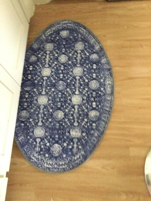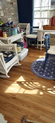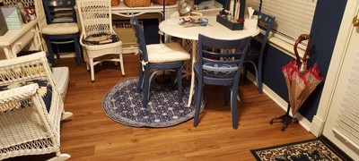 I got new wood veneer floors and this round blue rug fits just right under the table in my craft room so I won't scratch the floors. It's perfect!