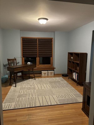 A: The rug features a unique geometric design with visually appealing staggered lines, adding a modern touch to any room.