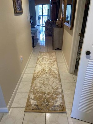 We have gold frames in the hallway and a side cabinet with gold items backed by a gold picture and frame, so I chose this rug, hoping it would go well with what we already have...and it DOES!! I also purchased the non-slip mat for underneath the rug; it really feels quite lovely, and it works well. Happy accident our dining room rug also has a little bit of gold in it, so it all works very well together. I took a few different pictures because the color looks a little different depending on which way you are walking (toward/away from the door). Hope you find this helpful. The delivery took about 7/8 days.