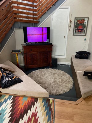 I bought this round shag rug for a small den. It’s perfect! It’s fluffy and soft on your feet.