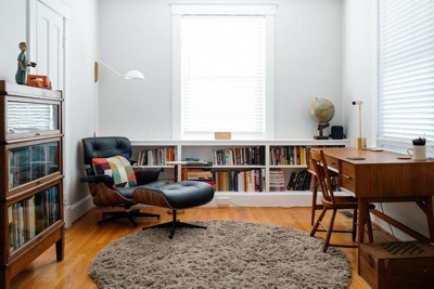 This 6x6 Rug is lovely. The khaki leans slightly cooler in tone than I had envisioned, but it works well for the purpose in this reading nook. The texture of the shag is very, very soft, almost like a long synthetic fur.