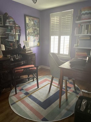 A: The rug features lightly distressed powder pinks, teals, and yellows, inspired by tropical beaches.