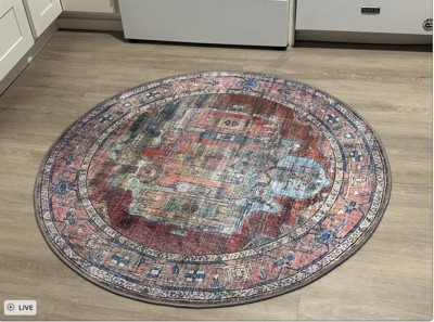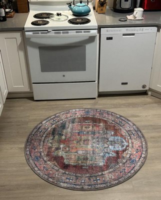 Love this rug! It has a beautiful design that goes great in my kitchen. It's small, less than 4' round about 3'10" round, but it is so beautiful. Very low nap, so works great in a kitchen.