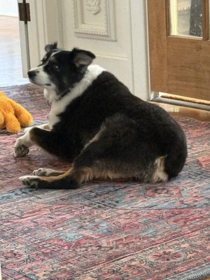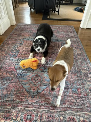 We bought the washable rug for our foyer, where our dogs generally lie and look out the door. It looks good and the dogs still love to lie there so it works out well. Haven’t washed it yet.