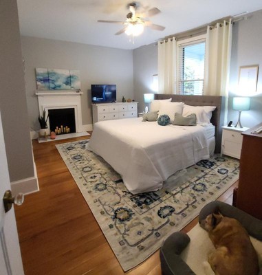 I bought this rug for the master bedroom. The 9x12 fit perfectly with our king bed.The rug is soft, good quality and even more beautiful in person.