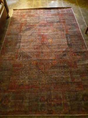 Love the rug! Great colors,abd WASHABLE- YAY! Was a little nervous ordering it sight unseen, but we love it! Was vetter than expected!
