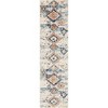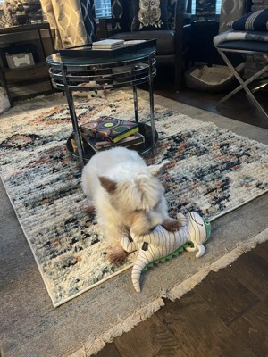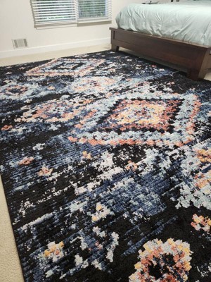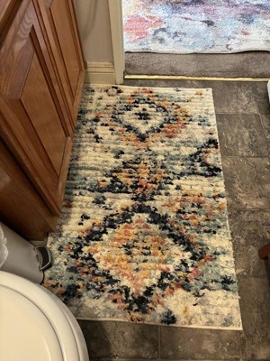 A: The rug features asymmetric, multicolor lattice patterns that blend geometric and abstract styles.