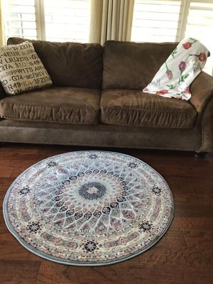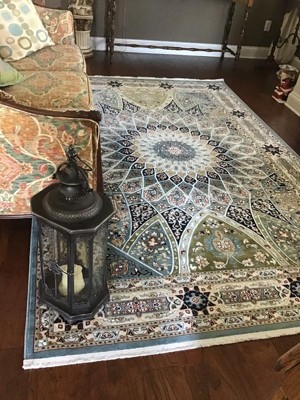 The rug was as describe on the site it arrived promptly. It laid out on floor without creases. Lovely colors