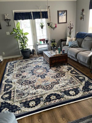 This rug has beautiful colors. The navy perimeter and center design makes the ivory color pop. After unfolding the rug, It took only a few hours for the rug to lay flat. I expect to get several years wear out of this rug and pad I placed in my livingroom.
