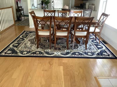 I bought this rug in blue in an 8x10 for my dining room and it is the perfect look that I was wanting. The colors are vibrant. I wanted a rug that had a design as a border instead of a typical border that one sees on a rug since my table and chairs were going to be covering the center of the rug and this rug has it. I chose not to purchase a rug pad since my dining table and chairs was going to be sitting on top of it giving it security. It was packaged well as to not allow damage or dirt to get on the rug during shipping. No flaws. It took about a week for the corners to lay down completely flat. I am very happy and satisfied with the rug. It is perfect for my dining room. It definitely adds beauty, touch of class and sophistication to my dining room.