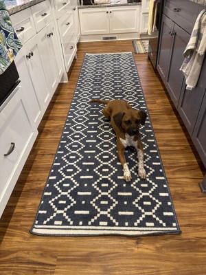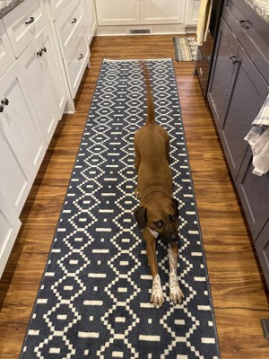 A: The rug features a Scandinavian-inspired design with geometric patterns and calming hues.