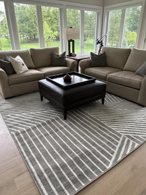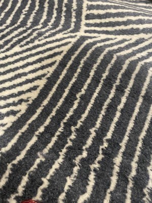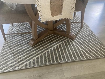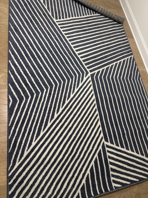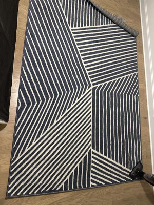 A: The rug features a minimalist Scandinavian design with captivating geometric patterns and calming hues.
