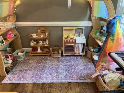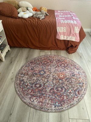 This rug has beautiful muted, yet colorful tones. The material is also soft which is nice for a toddlers bedroom. It adds the perfect pop of color to our daughters bedroom.