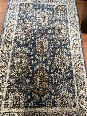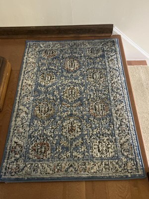 Beautiful rug! I moved into a new rental space with very specific colors. Walls are light blue and dark blue. Tan-ish tile on the ground. I needed something to blend the room, while also softening it up. This rug totally fit the bill! Rug arrived folded and sealed in plastic. It took very minimal time to acclimate once unpackaged. It's soft and has a good feeling to it. The colors and pattern matched the website exactly.