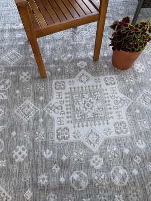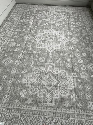 This outdoor Aztec rug in light gray is beautiful in design and color tones. It has a striking pattern done in a palette of ivory with shades of light gray and white. It has a nice balance of muted grays offering quiet color with a balance of white and ivory. The pattern is beautiful. This is my second outdoor rug from rugs.com and I am happy with both.