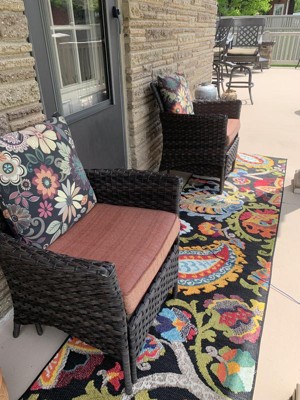 • CARE: For an outdoor rug, remove debris frequently with the use of a broom or blower. To wash, spray the surface with a soap and water mixture, then rinse thoroughly with a garden hose and hang over a railing to dry thoroughly. Rotate for even wear.