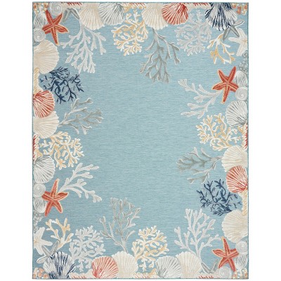 CARE: For an outdoor rug, remove debris frequently with the use of a broom or blower. To wash, spray the surface with a soap and water mixture, then rinse thoroughly with a garden hose and hang over a railing to dry thoroughly. Rotate for even wear.
