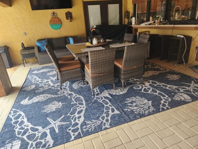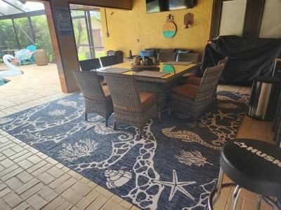 Guests appreciate the quality and aesthetic appeal of this rug, noting its vibrant colors and beautiful designs that enhance various spaces, from patios to kitchens. Many find it easy to clean and suitable for homes with children and pets. While some mention minor issues with curling edges or slipping, the overall satisfaction with the product's durability and style makes it a popular choice for both indoor and outdoor use.