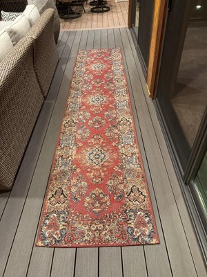 A: The rug is made from 100% polypropylene, ensuring durability and resistance to outdoor elements.