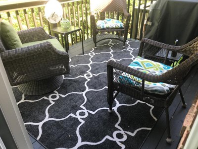 A: The rug is made from 100% polypropylene, making it durable and resistant to outdoor conditions.
