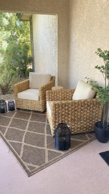 A: Yes, its flat-weave pile allows for seamless placement underneath furniture both indoors and outdoors.