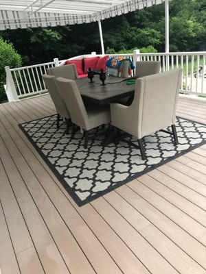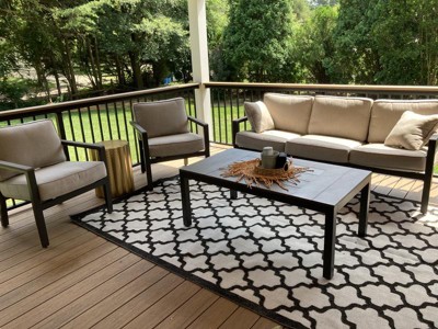 A: Yes, its flat-weave pile allows for seamless placement under furniture both indoors and outdoors.