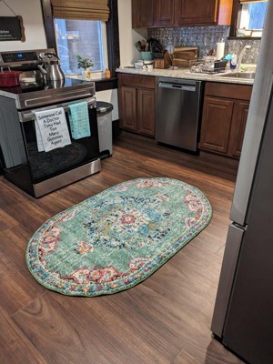 This rug looks fantastic in my daughter's kitchen. Complements the green cabinets and contrasts beautifully with the hardwood floor.