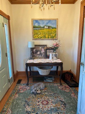 We love this rug! It’s in our kitchen and small ones are in our pantry. It looks so pretty with our green lower and white upper cabinets, maple hardwood floors and Georgian green walls. It’s a nice green background and the other colors really suit our palette.