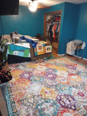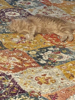 Love the colors in this rug! Kind of a distressed look but really picks up the colors in the room. We have a yellow accent chair which looks perfect with this rug.