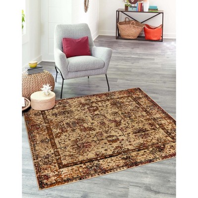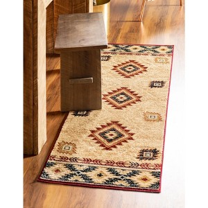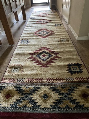 A: The rug combines Old West motifs and southwestern geometric patterns with earthy colors.