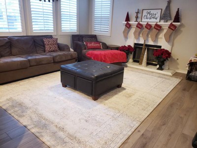 Soft and enjoyable to walk on. A true cream with dark gray and warm brown throughout, it works with our brown couch in the living room but I can see myself also using it upstairs as a neutral rug in our bedroom. It was folded into a rectangle for shipping but a few weeks later is crease-free and the edges stay down nicely. I’ve bought a few inexpensive rugs that weren’t worth it & but would definitely purchase this one again