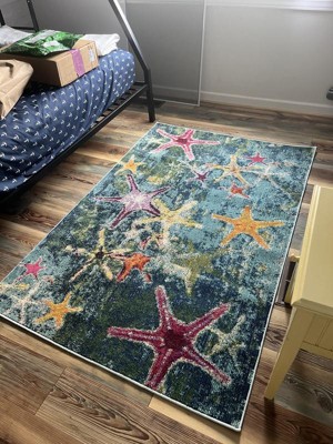 Bring a piece of the sea indoors with the marine motifs of the Positano Collection. This playful rug comes in several shapes and sizes, so it's versatile enough for any room. Colorful koi, starfish, and sea turtles adorn this fascinating rug.