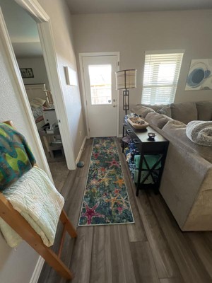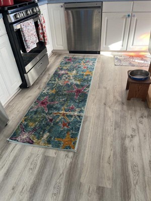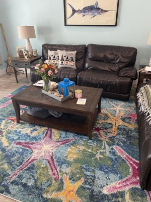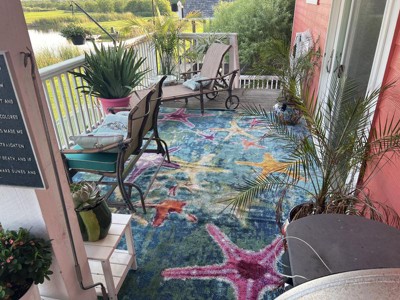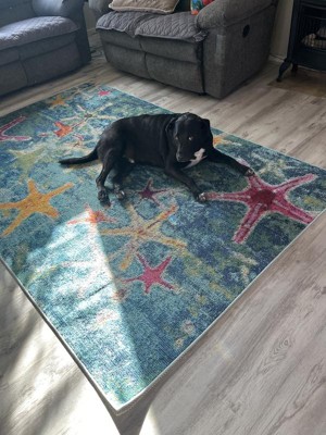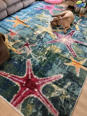 A: The rug features marine motifs, including colorful koi, starfish, and sea turtles.