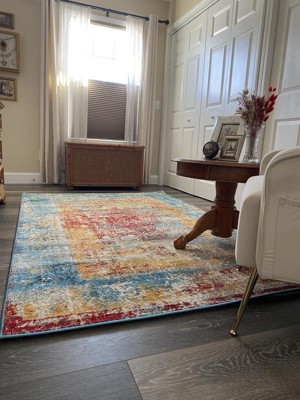 This rug is even more beautiful in person than the photos suggest! The colors are vibrant but not overbearing, and I love all the different hues from blues to orange, yellow, and red that are hinted throughout. I feel like the colors are compatible with almost anything, but without being an outright rainbow. The design is also beautiful because it is not abstract but not overly structured or patterned either so the result is something relaxing for the eyes: there is organization to the colors but not in an imposing way. I love this rug and everyone who has visited my home - men and women - love it too!