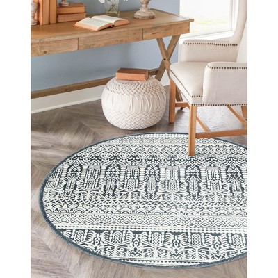 Size in FT: 3' 3" Round - Size in CM: 99 x 99 - Pile Height & Thickness: 1/2" - Colors: Blue, Ivory