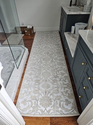 I bought two of these runners to use as my wedding aisle runner. They are so beautiful and perfect for the occasion. I like that they are three feet wide instead of the typical two and a half feet. The white background is pretty white and the beige design running through it is a cool taupe. The beige threads are taller than the white giving it a slightly dimensional look. The threads are thick for a tight knit appearance. I'm very satisfied with my purchase. It looks just like the online picture.