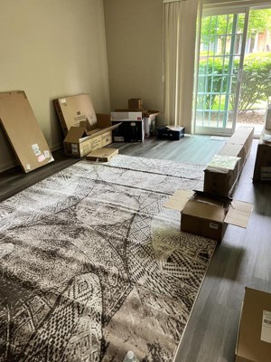 I absolutely love this eye catching pattern in neutral colors! It’s perfect for my living room and looks lovely. I am very pleased with the softness and thickness. I am especially happy the rug did not have any unpleasant odors. My only wish is the rug would have been rolled instead of folded for shipping. I would pay extra to receive my large rugs rolled. Creases are pain that do not go away in a “day or two.” I have a couple major ones that I’ve been trying to flatten with a small table but I think I’m going to need to try a hair dryer too for some heat. Overall I am happy and would order again.
