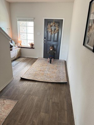 I’m really happy with this one, the colors are bright but blended from a distance. Golden, blues and yellows, along with creams. Our entryway is 20ft long and 6ft wide, and has a cutout to the left with hooks and a bench for shoes, I mention that because finding the right size of rug would have been impossible without their ai. I went through at least 50 rugs of different sizes, colors and styles. I really wanted a brighter color because it was kinda dark to begin with. I went with an indoor outdoor 5x8, and I think it works pretty well. I may end up changing it out, mainly so I have an excuse to order more rugs from them lmao. So many beautiful choices. This one is super easy to vacuum and keep clean. It did have a bit of a hard time relaxing, but I use rug tape on all my rugs so it wasn’t an issue. If you aren’t using tape I’d recommend steaming it and then placing something heavy on the edges. Rug tape is an excellent investment though. lol