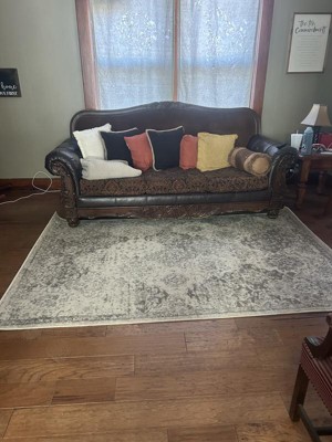 A: The rug showcases abstract, distressed effects and contemporary designs in light, neutral tones.