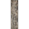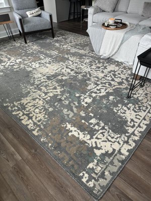 A: The rug features abstract, distressed effects with contemporary designs in light, neutral tones.