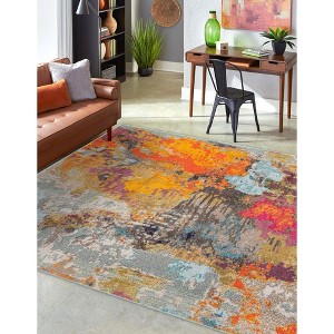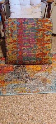 A: The rug showcases bright colors with playful abstract and geometric patterns.