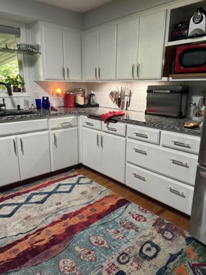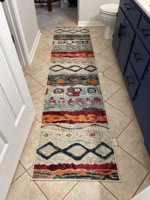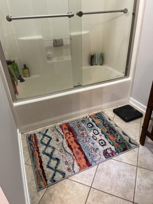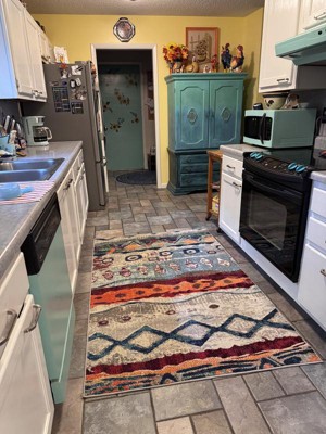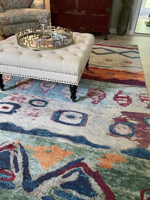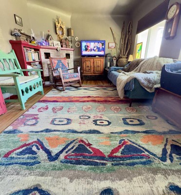 A: The rug features bright colors with playful abstract and geometric patterns, offering a contemporary industrial design.