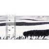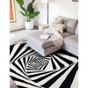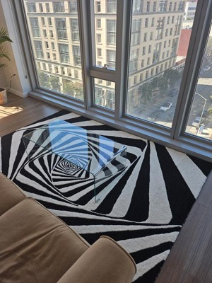 A: The rug features mesmerizing vortex patterns that create a sense of depth and movement.